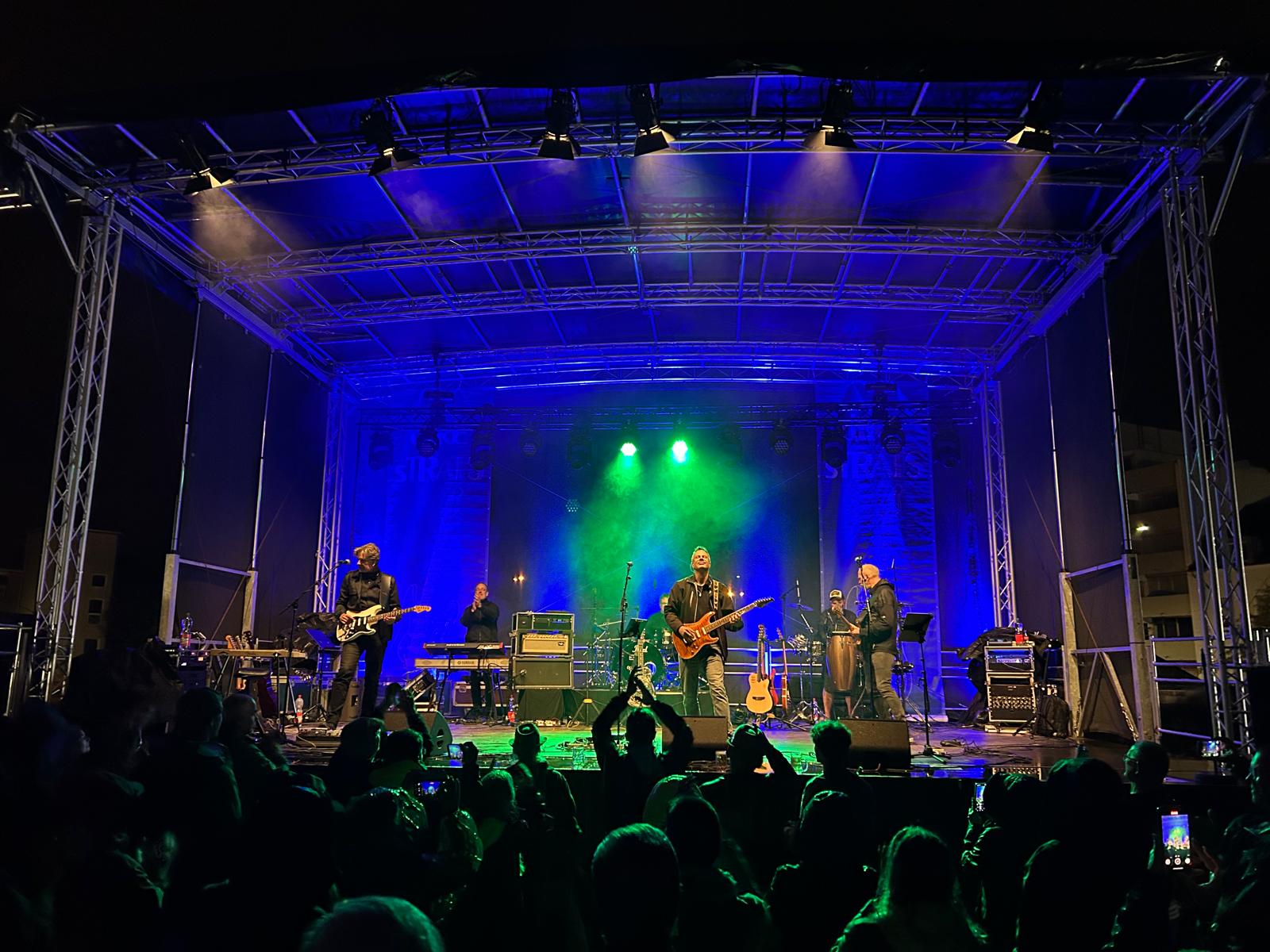 Es geht nach Saarlouis im Saarland. 4 kurze Stunden auf der Bahn – und schon sind wir da… Wir erreichen Saarlouis bei schönem Wetter. Nach dem Soundcheck haben wir noch zeit für einen Spaziergang durch die Parkanlage neben dem Konzertgelände. Noch beim Spaziergang denken wir: „Ach, das bisschen Regen in der Wettervorhersage spielen wir doch mit Leichtigkeit weg“. Wie wir uns irren sollten. Ist das Wetter bis kurz vor Konzertbeginn noch gut, ändert es sein Gesicht pünktlich zum Konzertbeginn. Es fängt an und hört nicht mehr auf. Gegen einen schönen Sommerregen ist ja nichts einzuwenden – aber gegen einen Herbstregen kommen wir kaum an. Die Temperaturen sind nicht sehr freundlich. Gespielt wird in Jacken und in voller Montur. Aber – gemäß der dIRE sTRATS Doktrin: Wir geben nicht auf. Wir versuchen immer das Beste aus der Situation zu machen – das war schon immer so. Und so verbringen wir einen schönen kühlen und regnerischen Herbstabend Open Air mit einem hartgesottenen und tollen Publikum. Respekt an dieses Publikum. Wir hätten Verständnis dafür gehabt, wäre es gegangen. Aber es bleibt! DANKE! Solche Konzerte haben wir SEHR selten.